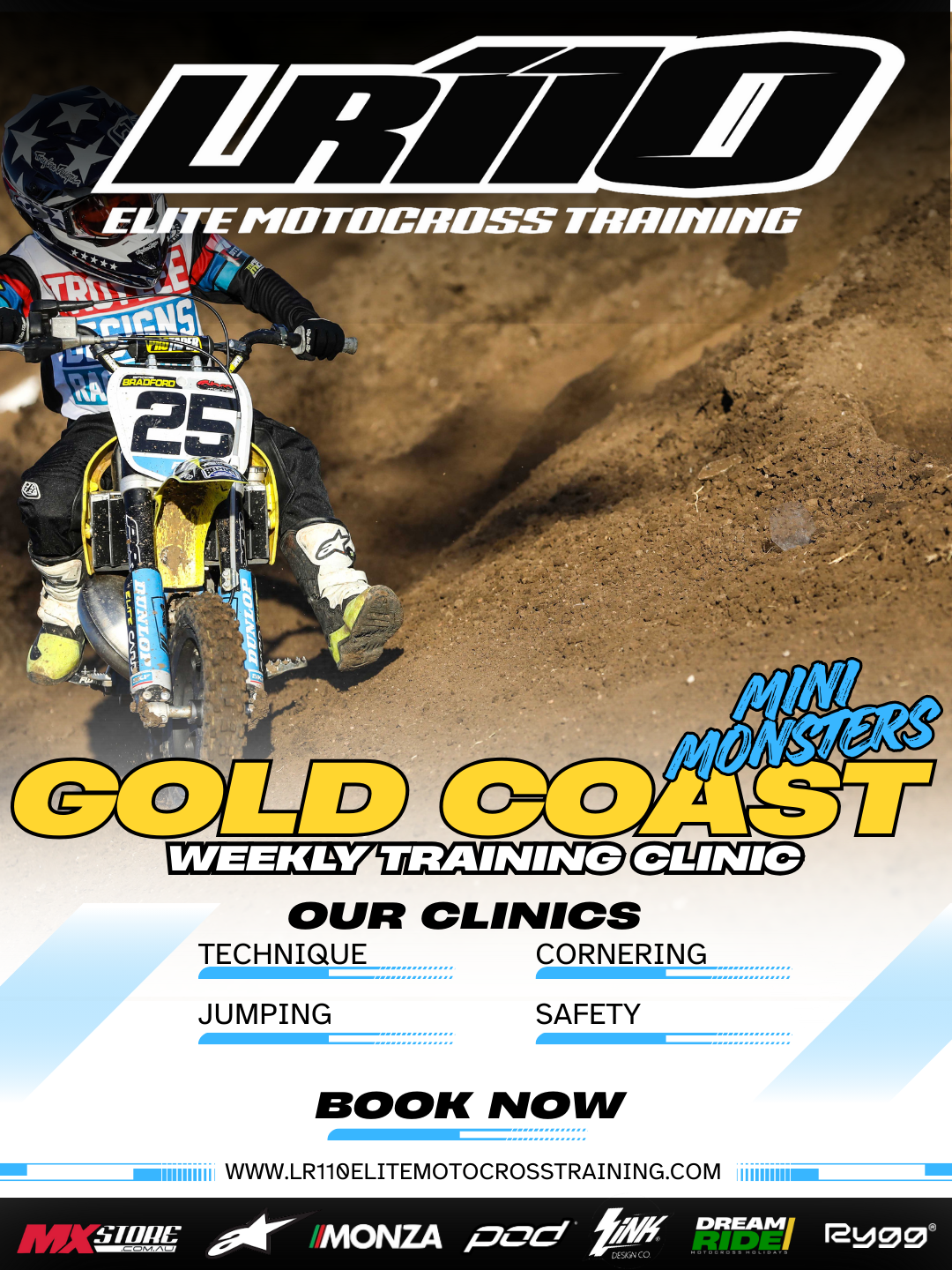 LR110 Elite Motocross Training offers a range of personalised training services - see below for our upcoming tours & clinics across Australia. When not on tour we offer weekly training sessions at a private Gold Coast track, Gold Coast Motocross Club, Willowbank & QMP. Please get in touch for availability for private sessions and small group coaching.